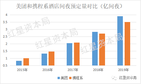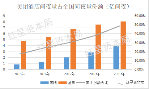 所谓“一日三餐”,餐饮外卖的频率最高,酒旅可归属于“季频和年频”业务,频率较低。美团通过高频的餐饮外卖业务给低频的酒旅业务引流,使得酒旅业务得到了快速发展,逐渐超过酒旅老牌巨头携程系。2018年美团酒店间夜量超过携程系,2019年美团酒店间夜量更是已经接近我国全年总间夜量的一半。