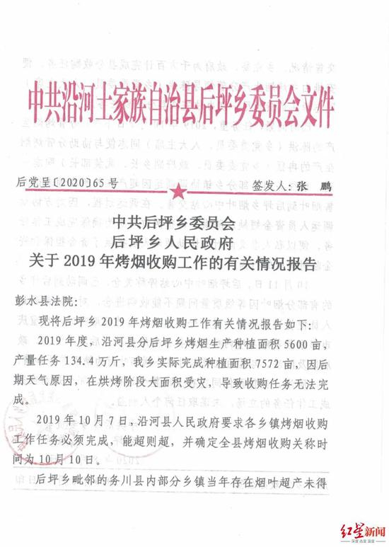 ▲后坪乡党委、政府出具的2019年烤烟收购工作情况报告