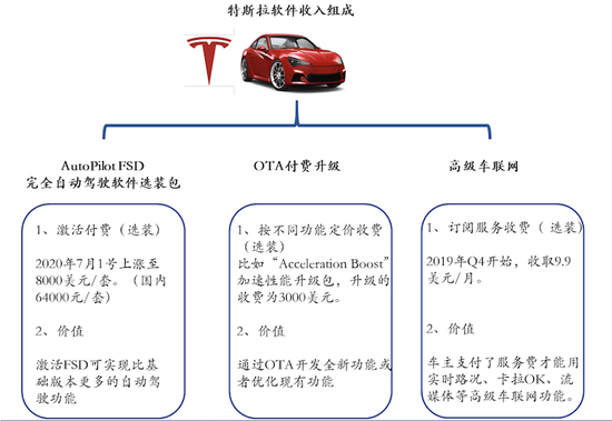 电动车涉及大量电子技术,在开发时需要涉及大量的对软件技术。因此,电动车产业一直有着“软件定义汽车”概念,特斯拉后来以此衍生出通过各种软件赚钱的商业订阅模式(上图)。