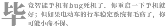 但是,汽车工程师却不容许发生任何差错。毕竟智能手机系统有 bug 死机了,你要重启一下就好;但如果电动车的行车稳定系统 (Electronic Stability Control, ESC) 有毛病了,你可能小命不保。因此,他们在研发时相对保守,部署任何新技术之前,必须经过周详部署和测试;因为他们清楚知道,犯错机会仅仅略增 0.001%,经过海量的行车次数放大后,仍然足以构成严重意外,并赔上车企的商誉。