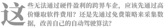 那到底这些无法通过硬件盈利的跨界车企,应该先通过高价赚取软件费用?还是先通过免费策略来采集数据,改善自己的自动驾驶算法?