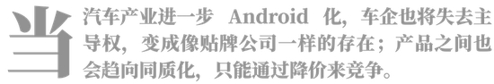 事实上,百度就公开表示自己的 Apollo 平台就是“自动驾驶的 Android”,而富士康也推出“ MIH 开放平台”,并明确表示要当“电动车的 Android”。当汽车产业进一步 Android 化,车企也将失去主导权,变成像贴牌公司一样的存在;产品之间也会趋向同质化,只能通过降价来竞争。