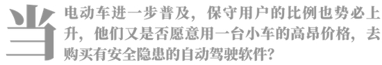 目前电动车仍处于发展早段,用户多属于勇于尝鲜的科技爱好者,所以,目前电动车的用户,也更愿意付费购买自动驾驶软件。可是,毕竟自动驾驶技术尚未成熟,仍然有一定的安全隐患;当电动车进一步普及,保守用户的比例也势必上升,他们又是否愿意用一台小车的价格,去买有安全隐患的自动驾驶软件?