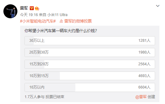 毕竟“小米模式”就是用低价产品吸纳用户,这些用户也必然对价格更为敏感。小米早前曾发微博调查用户心目中想要的价格(上图),结果最多人想要的,是一台 10 万元以内的汽车(虽然雷军坚持称,粉丝希望他们做 10 万 ~ 30 万的“中高端”汽车)。试想:这些仅愿意用 10 万元不到买一台电动车的用户群体,有多少人愿意为自动驾驶软件而再付数万元?