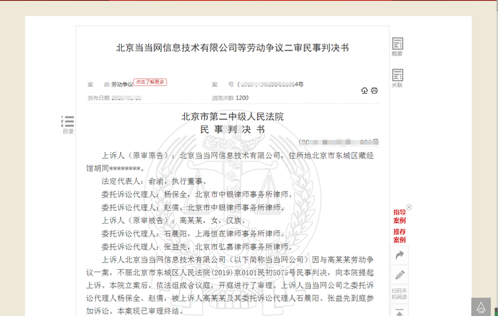 据中国裁判文书网官网披露的一则民事判决书显示,2015年4月13日,高某某入职北京当当网信息技术有限公司,担任技术部产品总监,双方签订两份劳动合同,最后一份劳动合同到期日为2019年4月12日。高某某的月薪为51259元。
