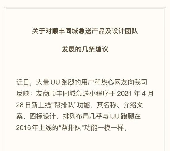 近日,UU跑腿官微发声喊话顺丰,在《关于对顺丰同城急送产品及设计团队发展的几条建议》一文称,顺丰同城急送小程序的帮排队功能,与UU跑腿在2016年上线的帮排队功能相同。