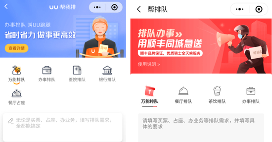 今年4月,顺丰同城在成都、武汉等城市上线帮排队功能。在顺丰同城急送小程序可以看到,其中包括餐厅排队、茶饮排队和办事排队等服务。