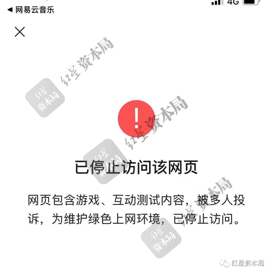 值得一提的是,网易云“性格颜色”的链接在朋友圈很快便遭到腾讯“屏蔽”。微信提示网页显示,该链接包含游戏、互动测试等内容,已停止访问。