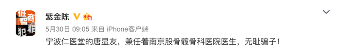好在到了30早上6点多,紫金陈的药物反应也过去了。此外,紫金陈30日上午还发文称为其打针的医生唐某为“无耻骗子”!