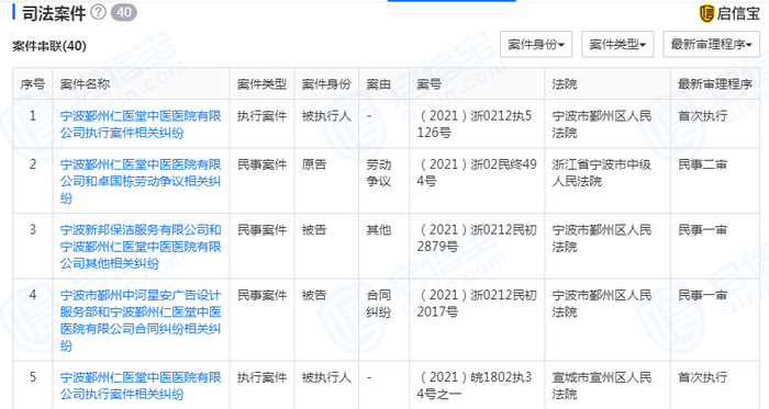 今年5月,仁医堂中医医院被宁波市鄞州区人民法院列为被执行人,执行标的超14万元。