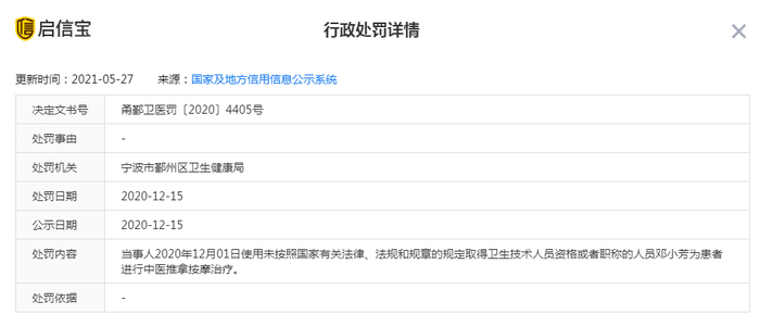 2020年12月,该公司还因使用未取得卫生技术人员资格或者职称的人员为患者进行中医推拿按摩治疗被行政处罚。