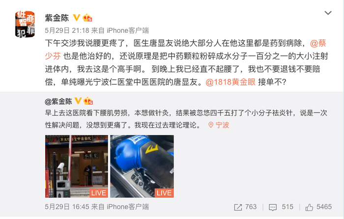 29日晚上,@紫金陈更新微博表示,下午去和医生交涉的时候,医生表示,绝大部分人在他这里都是药到病除,还说原理是把中药颗粒粉碎成水分子一百分之一的大小注射进体内。“到晚上我已经直不起腰了,我也不要退钱不要赔偿,单纯曝光宁波仁医堂中医医院的唐显友。”