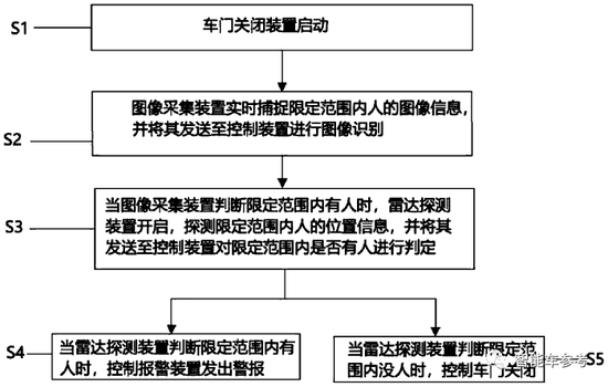 车门防夹系统。利用图像采集装置实时捕捉限定范围内人的图像,并将其发送至控制装置进行图像识别, 当图像采集装置判断限定范围内有人时,雷达探测装置开启,探测限定范围内人的位置信息。