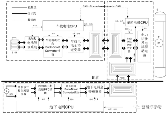 非独立供电模式则由车载电池无线充电系统和地下电网无线充电子系统联合对车轮电机供电;