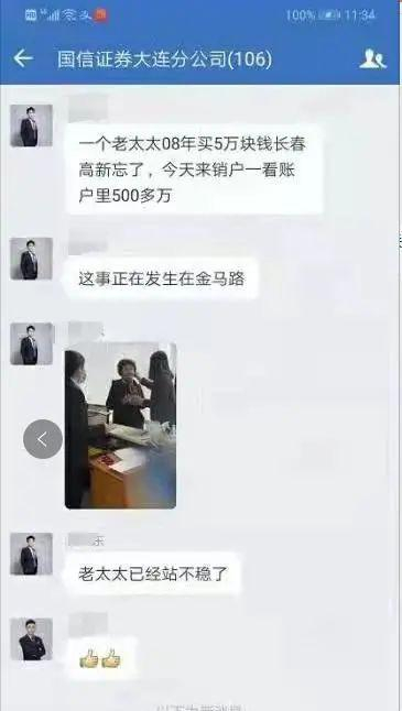 一个是大连有个大妈去证券公司销户,发现她在2008年买的5万块长春高新,现在市值已经超500万,大妈得知大受刺激,腿一下子就软了,幸好被工作人员扶住。13年100倍,是我我也站不住。