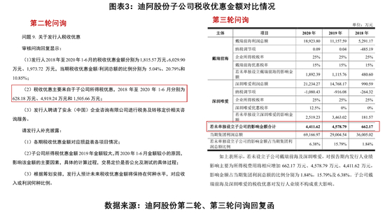 此外,深交所在三轮问询中均针对税收优惠向迪阿股份提出质疑。其中,在第二轮问询回复函中,迪阿股份提到,2018—2020年上半年,公司的税收优惠金额分别为1815.57万元、6029.9万元、1973.72万元。其中,来自子公司戴瑞前海、深圳唯爱的所得税优惠总额分别为628.18万元、4919.24万元、1505.66万元,占比较高。