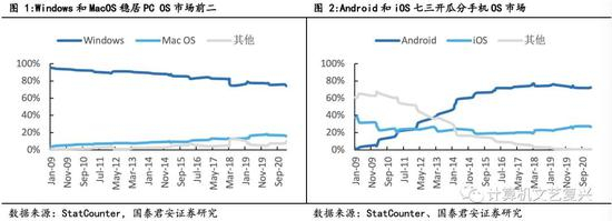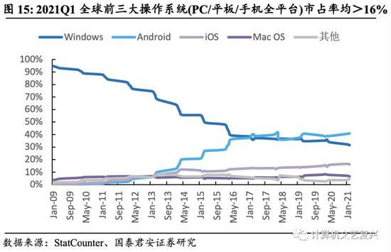 实际上大家返回我们第一个问题下操作系统市场格局变动图,在新生的智能手机操作系统市场上,行业第二的iOS的市占率一直保持在18.7%以上;在平板操作系统上行业第二安卓在2013年年的发展早期市占率刚好在16.57%,此后逐步上升;只有PC操作系统略微不同,在2019Q4时行业第二的Mac OS市占率才刚刚提高到16.36%;如果将三个平台放到一起看,截止2021Q1全球前四大操作系统AndroidWindowsiOSMaOS的市占率为40.97%31.47%16.16%6.75%,这些历史数据也是对华为上述判断的一个支撑。