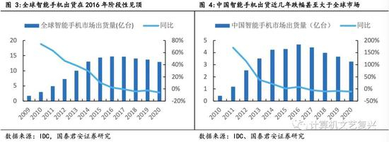 我们来看IDC的一组手机出货市占率数据,2019Q2华为手机的全球出货市占率为17.71%,位居全球第二,之后几个季度华为的市占率及排名并未有明显波动,甚至受益于国内疫情的率先管控以及提前备货,在2020Q2华为的全球出货市占率达到20.04%,排名首次登顶;但自2020Q3开始,华为的全球市占率快速下降,在2021Q1市占率跌至仅有6.92%,市场排名跌至第6,沦为“Others”;华为在海外市场的市占率也自2020Q2的9.85%跌至2021Q1的2.05%;国内市场表现也同样相当残酷,在2021Q1国内手机总出货量同比增长30%的情况下,华为出货量同比下降35%,市占率出现腰斩,市场排名跌至第三。