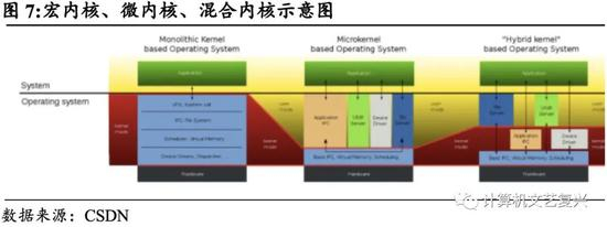从王成录的表态来看,我们推测鸿蒙系统目前在手机等高算力设备上还是主要使用Linux内核,鸿蒙微内核作为正处于快速开发阶段的备用内核未来可能逐步替换其他内核,这也是产业发展和生态建设的正常过程,不应过度神化或者妖魔化鸿蒙系统。我们拓展一下对微内核的理解,简单来说其核心思想就是尽可能简化内核的功能,内核只提供最基础的服务,如多进程调度、多进程通信(IPC)等,将原先宏内核包含的不少系统服务(如文件系统、虚拟内存管理、网络协议栈等)放到用户态应用,变成一个个服务,等待其他应用的请求。这样的好处的系统服务模块化、可插拔、易于拓展、安全性更高等等,且经过技术的长期发展目前微内核的性能表现已经不亚于宏内核。