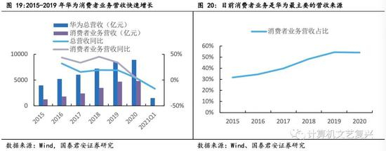 鸿蒙之于华为的消费者业务,短期而言是救命稻草,长期而言则是战略转型的起点。2015年至2019年间华为的消费者业务营收占比自31.69%提升至54.41%,营收的年复合增速达到39%;2020年面对疫情等冲击,华为消费者业务营收同比仍增长3.34%,营收占比依旧保持在54.18%的高位,因而消费者业务的波动将对未来华为公司的发展产生重大影响。2021Q1华为整体实现营收1500.57亿元,同比下滑16.92%,负面影响开始凸显。
