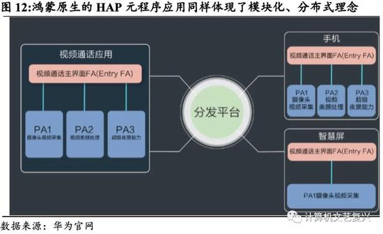 基于鸿蒙系统原生的APP为HAP格式,一个HAP应用包含一个或多个FA/PA基本组成单元,FA有UI界面,PA无UI界面。例如,一个视频通话应用,“视频通话主界面FA”提供UI界面以便于用户交互,PA1/PA2/PA3分别提供摄像头视频采集/美颜处理/超级夜景能力等,一个HAP应用在不同设备终端上可以按需下载、加载、运行FA/PA,继续上述视频通话应用,手机会下载全部的FA/PA模块,而如果智慧屏硬件不支持美颜和超级夜景能力,他就只下载主界面FA和摄像头视频采集PA1即可,从而减小安装包,提高程序的特定功能运行效率。