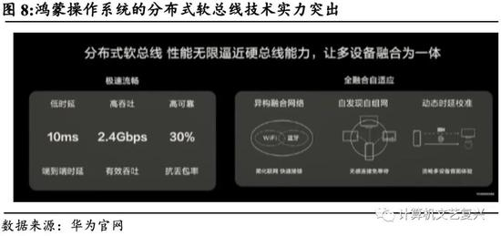 分布式系统的核心是实现各硬件的互联互通,实现各种设备通讯语言的统一,因而做通讯业务出身的华为在做分布式系统上具有降维打击的优势。目前设备与设备之间的链接存在大量延迟、丢包等问题影响用户体验,这背后的原因在于现在的网络通讯标准协议是在一个低速网络中创造出来的,我们现在所使用的 TCP/IP 等各种网络协议都诞生于 20 世纪 70 年代,当时冷战的时代背景带来了许多来回握手协议,设备与设备之间的互联会天然地有网络带宽延迟、丢包等问题,但也表示其有被大幅提升的空间。华为本身做通讯业务出身,其最精通通讯协议技术,目前的华为主推的HiLink、Share Kit协议已经对过去很多网络通讯协议做了大幅修改,他们已经不再是标准的协议,这让华为鸿蒙的通讯速度变得更快,所以华为在做分布式系统上可以说有降维打击的优势。