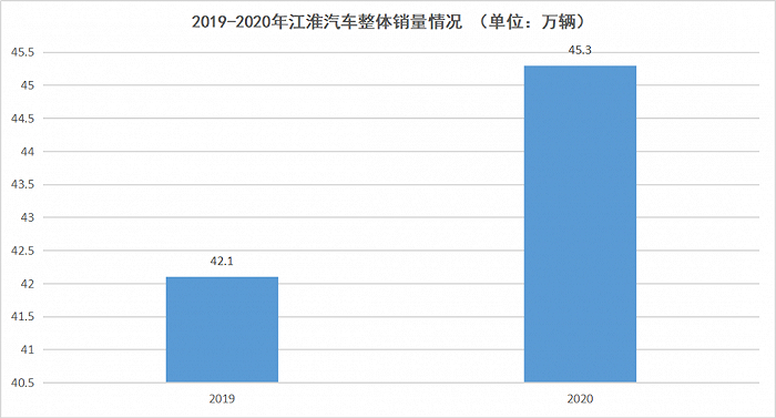 据江淮汽车公布数据显示,2020年全年其累计销量为45.3万辆,完成年初预定销量目标,同比增长7.63%。而在2019年,江淮汽车的整体销量为42.1万辆,同比下降8.91%。