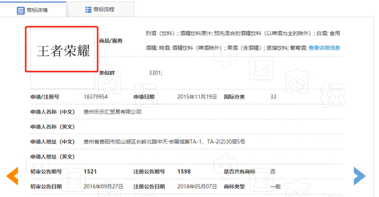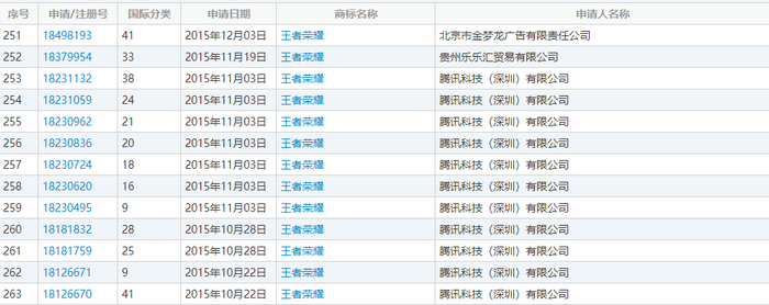 国家知识产权局商标局官网显示,王者荣耀商标的最早注册记录是在2015年10月22日,由腾讯科技(深圳)有限公司注册,自此至乐乐汇申请注册的2015年11月19日,腾讯方面共申请了11个不同类别的王者荣耀商标,不过其中并不包括乐乐汇的第33类。