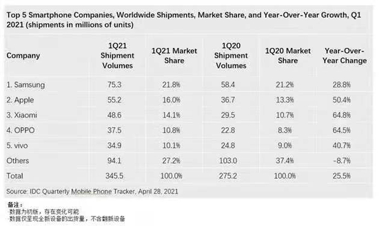 魅族一家企业的支持力量是薄弱的。据IDC发布的2021年Q1 全球智能手机销量数据显示,尽管华为掉出前五,头部玩家还是老面孔,三星、苹果、小米、OPPO、vivo占据了总数的72.8%。根据2020年的数据,魅族可能只占据国内市场的0.3%市场份额。