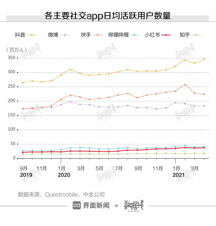 小红书日活量在主要社交app中排名第五,一直与B站非常接近。抖音日活量第一,平均有每天近3.5亿用户使用,是小红书的7倍。
