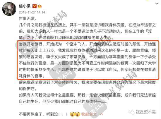 不止财务出现危机,连身体也吃不消。信小呆曾经在采访中说到,她的大部分旅行都是走马观花,很多时候只能睡2-3个小时,身体承受不住旅行的强度,频繁生病。