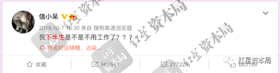视频中,信小呆回忆起中奖的那一刻,“大脑一片空白,隐隐约约感觉自己下半辈子不用愁了”。红星资本局翻看信小呆的微博看到,2018年10月7日,信小呆在得知自己成为锦鲤后发了一条微博:“我下半生是不是不用工作了???”