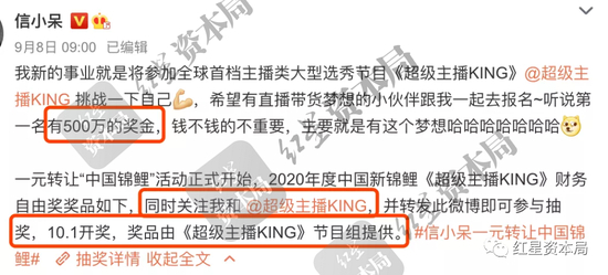 2020年9月,信小呆在微博宣布,要1元转让“支付宝锦鲤”身份,得到身份的人将会获得“财务自由奖”。第一名有500万奖金,该奖品由一档主播类大型选秀节目《超级主播KING》提供。