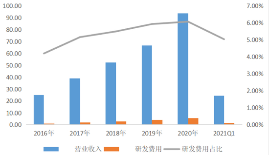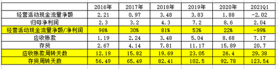 存货风险在上升。根据财报披露信息,近5年来,公司的归母净利润呈上升趋势,但经营活动产生的现金流量净额却没有随之稳步增长,净现比持续降低。2020年公司归母净利润为8.6亿元,同期经营活动产生的现金流量净额只有1.9亿,净现比为22%,2021年1季度这一比率甚至降至-0.99%,公司净利润的含金量持续下滑。