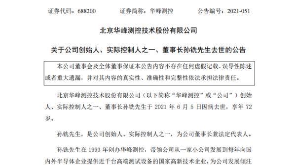 6月6日,国内半导体检测设备龙头企业华峰测控发布公告称:创始人、实际控制人之一、董事长孙铣先生于2021年6月5日因病去世,享年72岁。