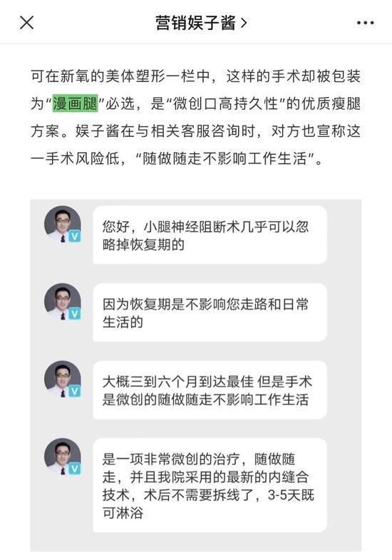 根据公众号营销娱子酱的说法,在新氧App里,这项手术却被包装为‘漫画腿’必选,是‘微创口高持久性’的优质瘦腿方案。