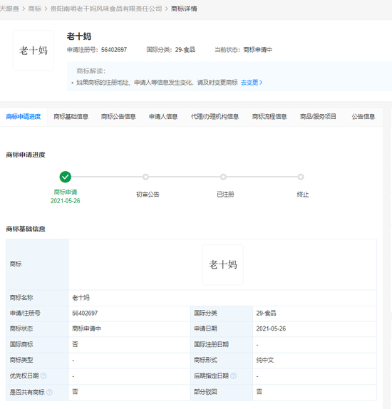 天眼查App显示,近日,贵阳南明老干妈风味食品有限责任公司申请注册“老十妈”商标,国际分类涉及食品、方便食品,当前商标状态为“商标申请中”。