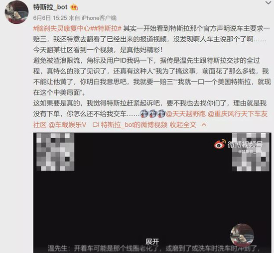 6月6日,一位名为“特斯拉_bot”的网友在微博上曝光了一段疑似特斯拉维权车主温先生的录音。