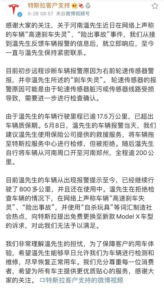 有关此次维权事件,特斯拉客户支持官方账号曾在5月28日回应温先生车辆的具体情况。据悉,温先生的车辆行驶里程已逾17.5万公里,已超出车辆保质期。并且,温先生一直拒绝对车辆进行检查。特斯拉称,自该车辆出现报警提示至发布声明,温先生的车辆已经继续行驶了800多公里,并且还在使用中。