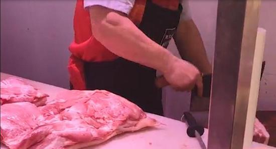 记者转而前往“钱大妈”门店内观察。肉食加工区附近,招牌显示肋排、软排、带骨大排、优鲜排骨等数十种猪肉部位分割图解。敞开式的冷柜里摆放着8盘已经分解好的猪肉,白花花的8个蹄髈陈列其中。紧贴着一处不锈钢台面上,放置了一块约2平方米塑料面板,这里是剔肉区。切肉师傅拿起一摞尚未拆分的肋骨,毫不费力地用短刀剔除余肉,剥离出4根排骨,转身将排骨放在一角的木墩案板上,再换一把笨重的砍骨刀利索地挥下。沉闷的“咚咚咚”声出现,但声量级比记者预料的小很多。