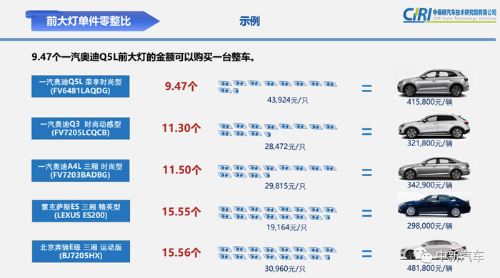 如果将一辆北京奔驰C级轿车的零件拆开卖,能买回8辆整车。而9.47个奥迪Q5L的前大灯就可以买回一辆Q5L新车。近年来,豪华车市场份额不断扩大,但越来越多的人在拥有豪华车之后才发现,修车比买车贵多了。