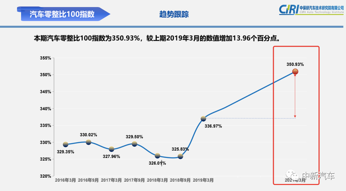 数据显示:本期“汽车零整比100指数”为350.93%,较上期增加了13.96个百分点;“常用配件负担100指数”为17.31,较上期增加了1.15。也就是说,在过去两年间,主流产品的配件和常用配件的平均价格均呈现出上涨趋势。