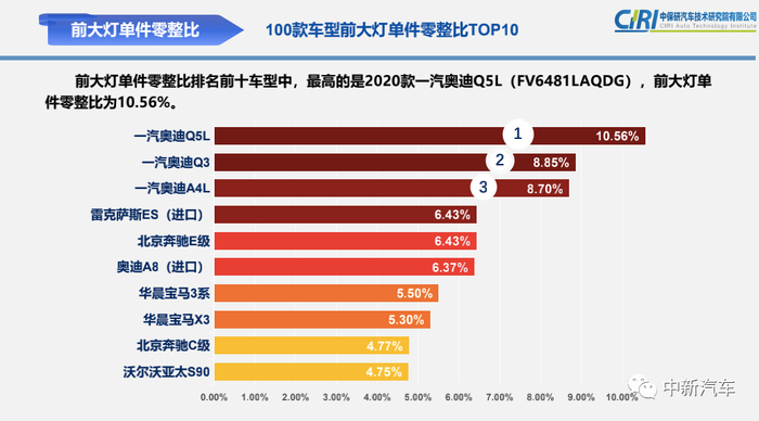 而2020款一汽奥迪Q5L是前大灯单件零整比最高车型的车型,其单个大灯的售价高达43924元,与415800元的车型售价相比,相当于9.47个前大灯就可以买一辆新车。值得注意的是,在前大灯单件零整比榜单上,排名前三的车型均出自奥迪品牌,排名第二及第三的车型分别是奥迪Q3以及奥迪A4L。