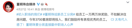 4月27日,董明珠在微博上表示,给员工一万两万块奖励,不如解决住房问题,今年3700套房即将投入,我们鼓励所有表现优秀的员工。