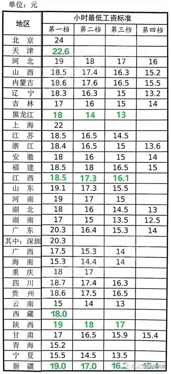 根据2021年发布的最低工资标准,全国31省,小时最低工资标准最高的是北京24元/小时。其次,天津、上海、广东小时最低工资均超过20元,小时最低工资最低的是云南15元/小时,其次,海南、青海,宁夏小时最低工资标准基本都在15元/小时左右。