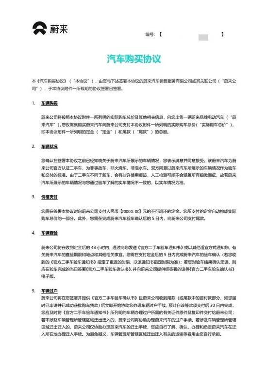 根据购车协议,蔚来方面会向消费者提供一份《官方二手车验车确认书》,车主在签署该确认书后才能完成购车流程。不过,刘先生表示,自己至今仍未收到《官方二手车验车确认书》。“买车之前,我们多次要求蔚来工作人员提供车况报告等文件,不过对方一直没有提供给我们,给了钱就说可以把车开走了。”
