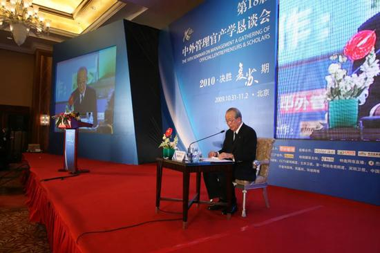 中外管理创始人杨沛霆、稻盛和夫、张瑞敏在第18届中外管理官产学恳谈会上交流