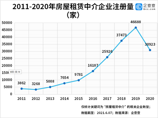 2019年房屋租赁企业注册量呈直线递增趋势,达到顶峰后,在2020年开始下降。而这些存续中的相关企业,基本为中小规模的中介。