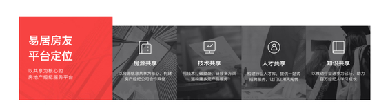 易居房友首页显示,平台定位为,以共享为核心的房地产经纪服务平台,共享的内容主要有房源、技术、人才和知识。