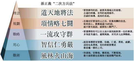 孙正义熟读《孙子兵法》,并且提炼了兵法中的25字口诀:一流攻守群,道天地将法,智信仁勇严,顶情略七斗,风林火山海。